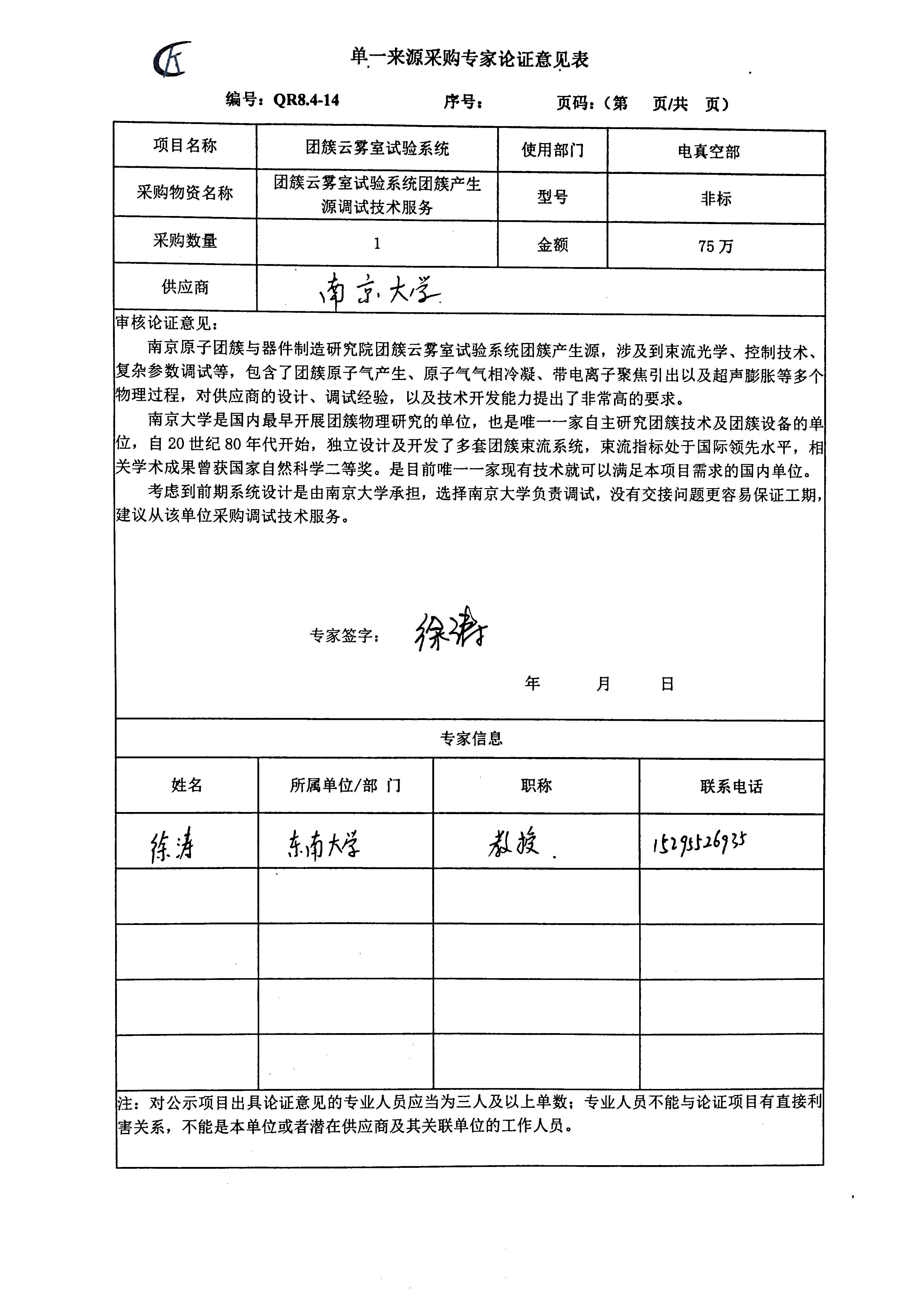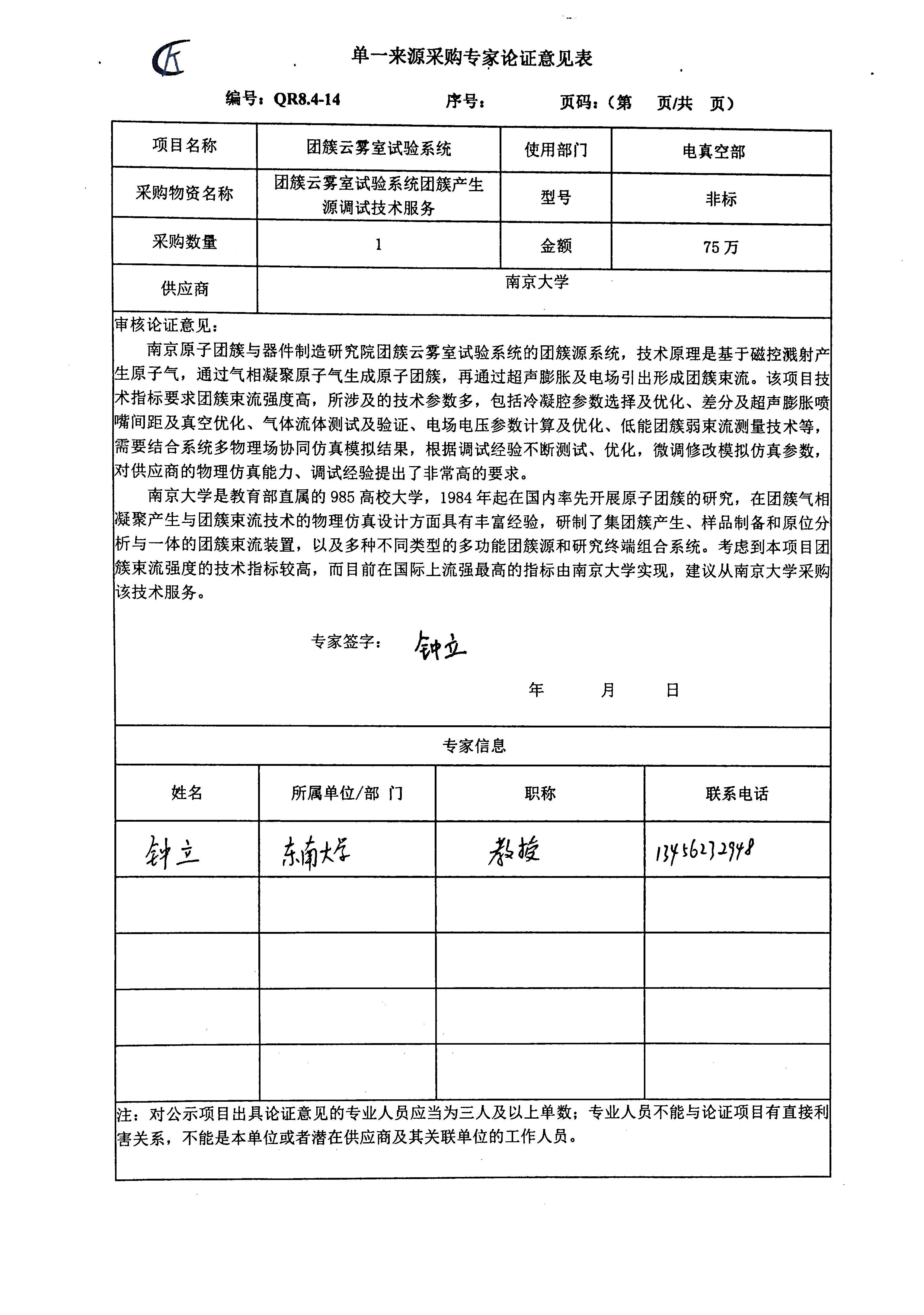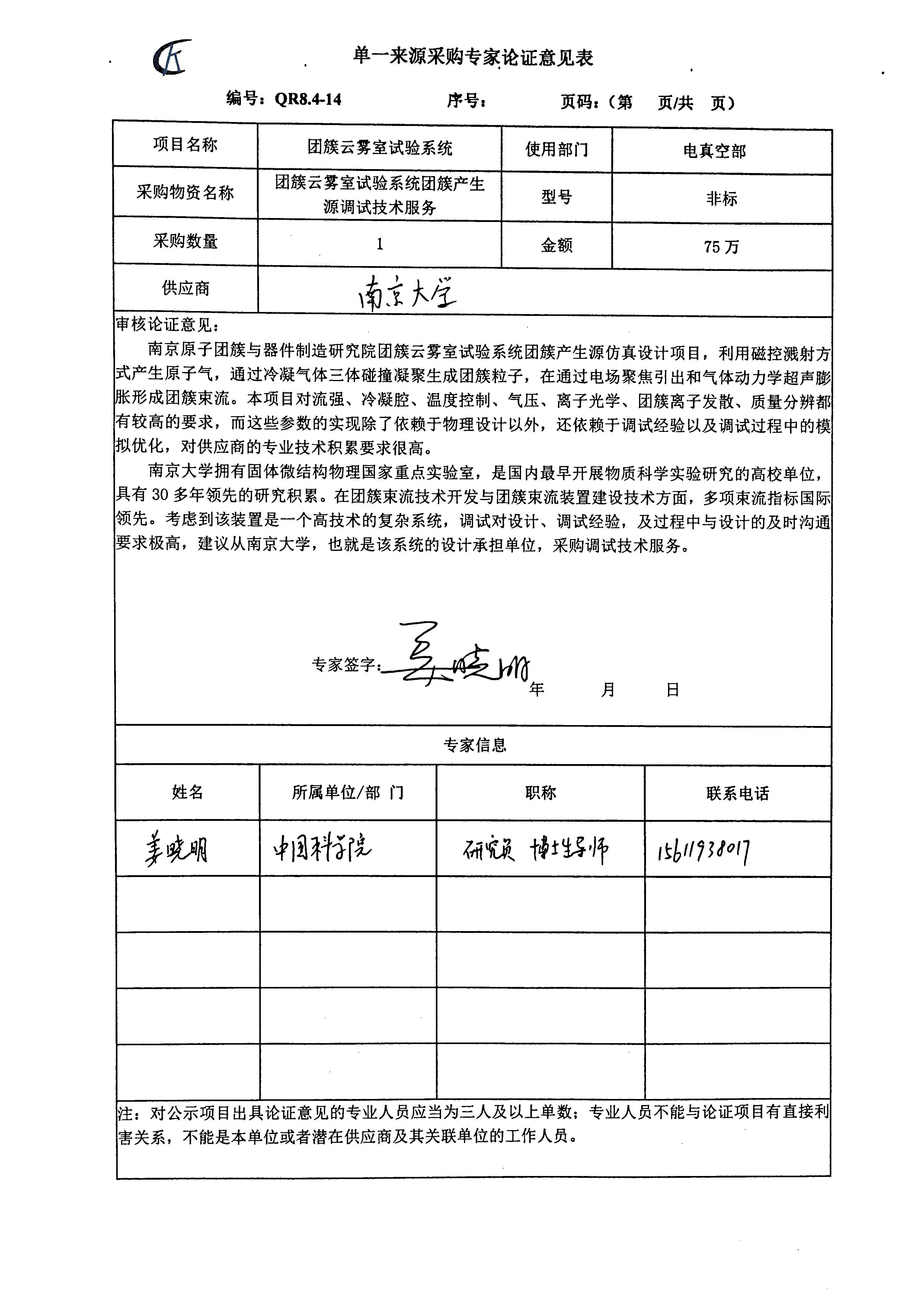 科近泰基新技术有限公司团簇云雾室试验系统团簇产生源调试技术服务项目拟采用单一来源方式进行采购,该项目拟由南京大学承担。现将有关情况向潜在供应商征求意见。征求意见期限从2025年12月19日起至12月22日止。潜在供应商对公示内容有异议的,请于公示期满后两个工作日内以实名书面(包括联系人、地址、联系电话)形式将意见反馈至科近泰基新技术有限公司综合部采购组,逾期无反馈意见,视为无意见。