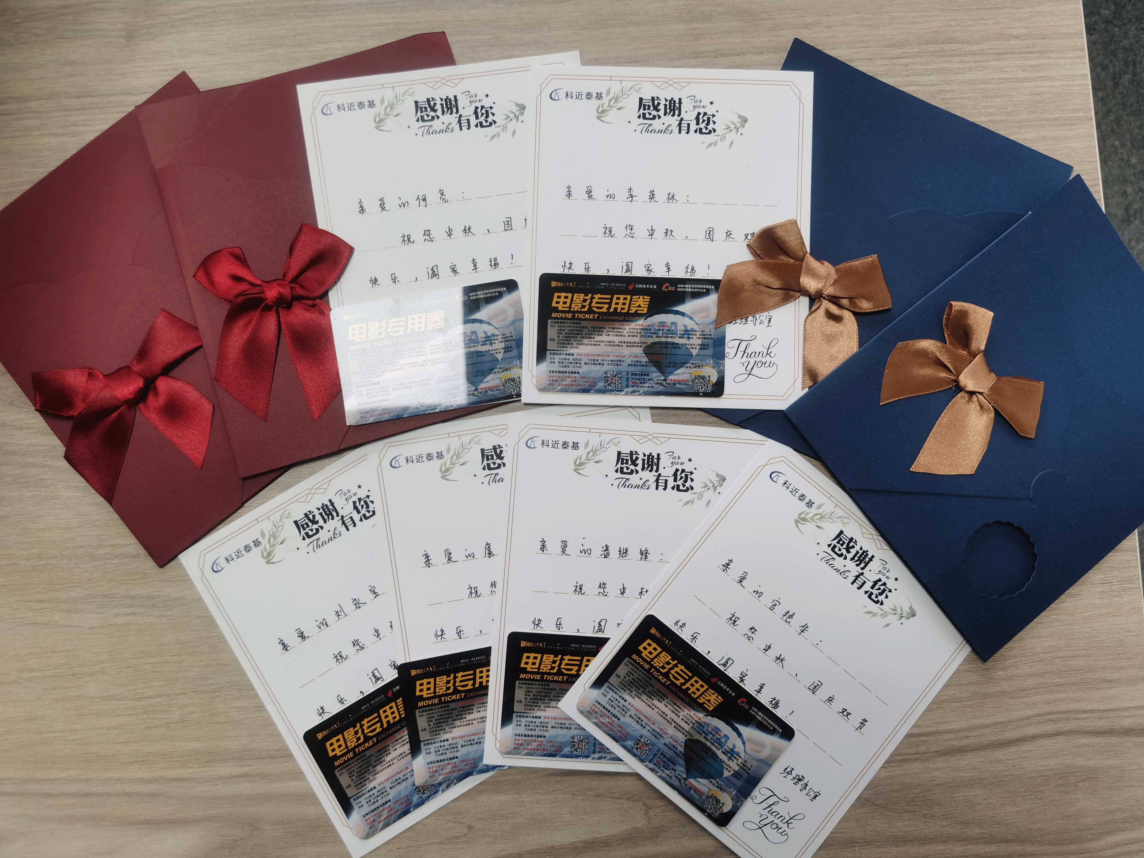 在中秋、国庆双节来临之际,公司为专职员工提前发放了福利卡(具有观影、购买蛋糕、购买图书等功能),并专属定制了精美贺卡。